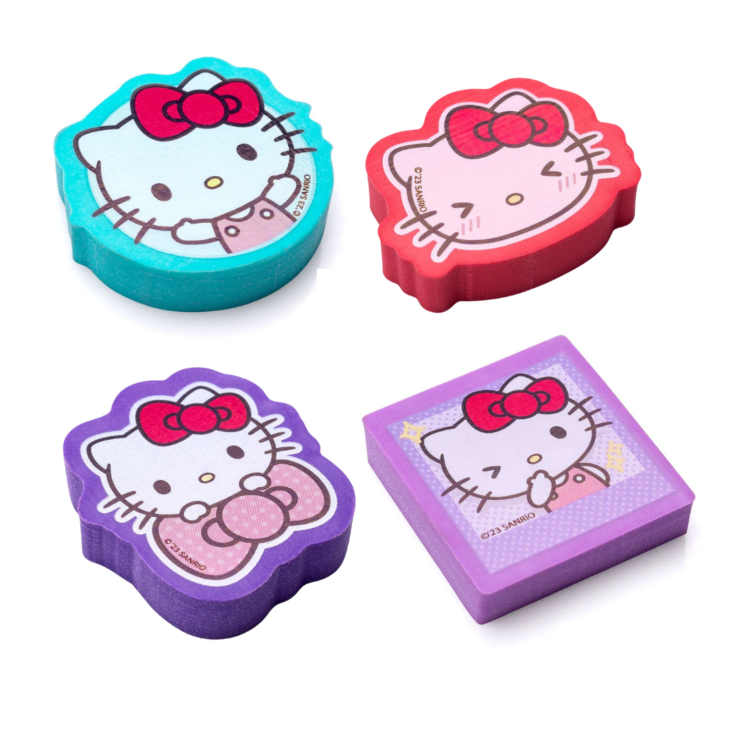 As borrachas vêm decoradas com 4 estampas diferentes da carismática Hello Kitty. Elas possuem 4 cores exclusivas e formatos personalizados da personagem apresentando poses em situações repletas de fofura