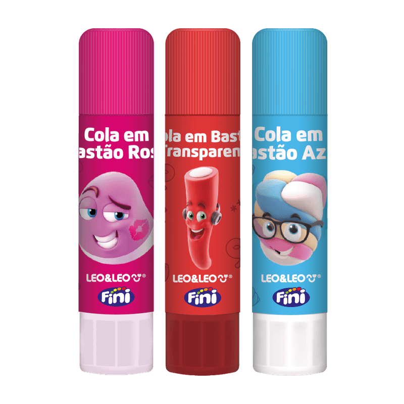 Além de vir com exclusiva estampa da FINI com seus divertidos personagens, a cola bastão apresenta cola colorida com mecanismo de rosquear no seu corpo. São 3 personagens diferentes, em 3 cores variadas no corpo: azul, vermelho e rosa.