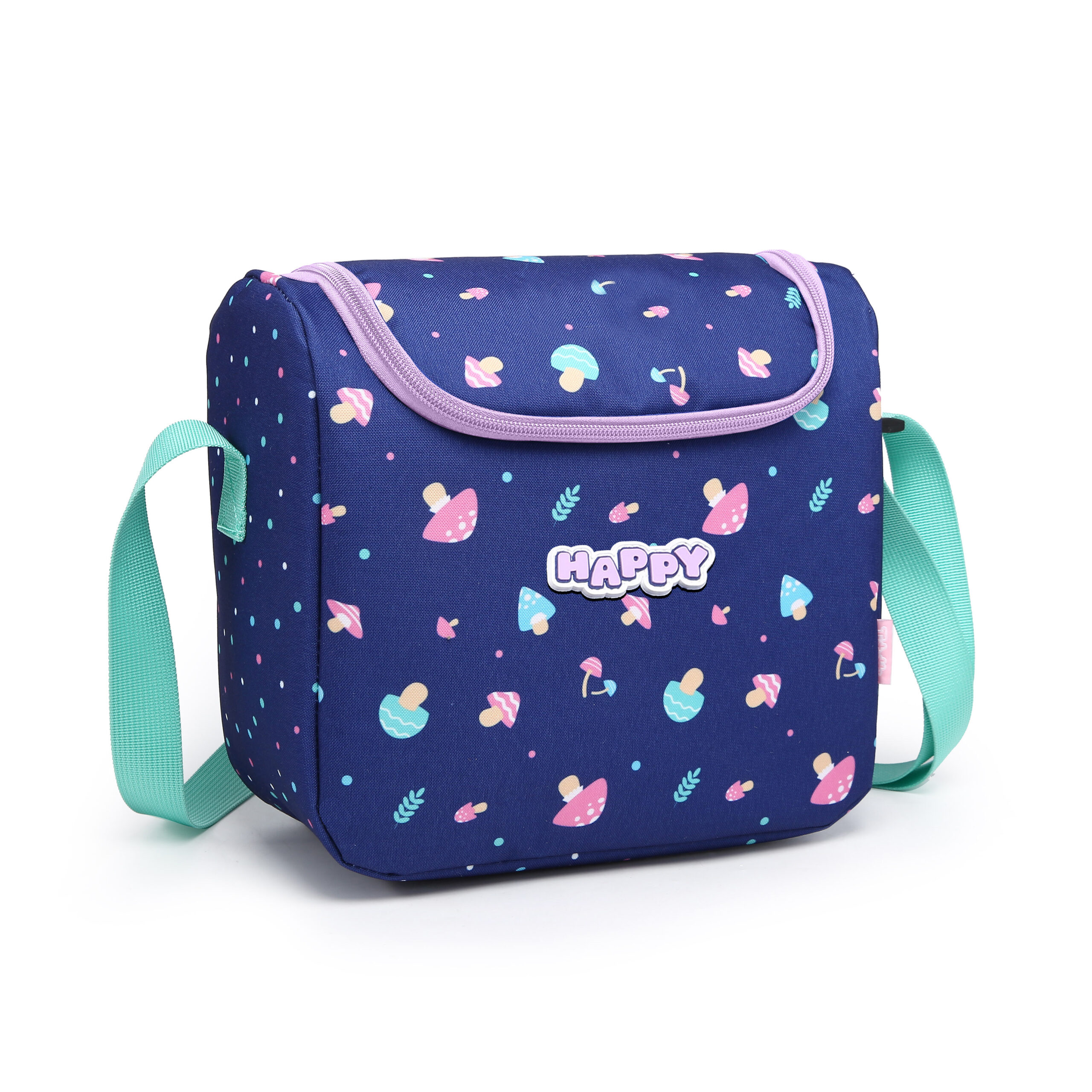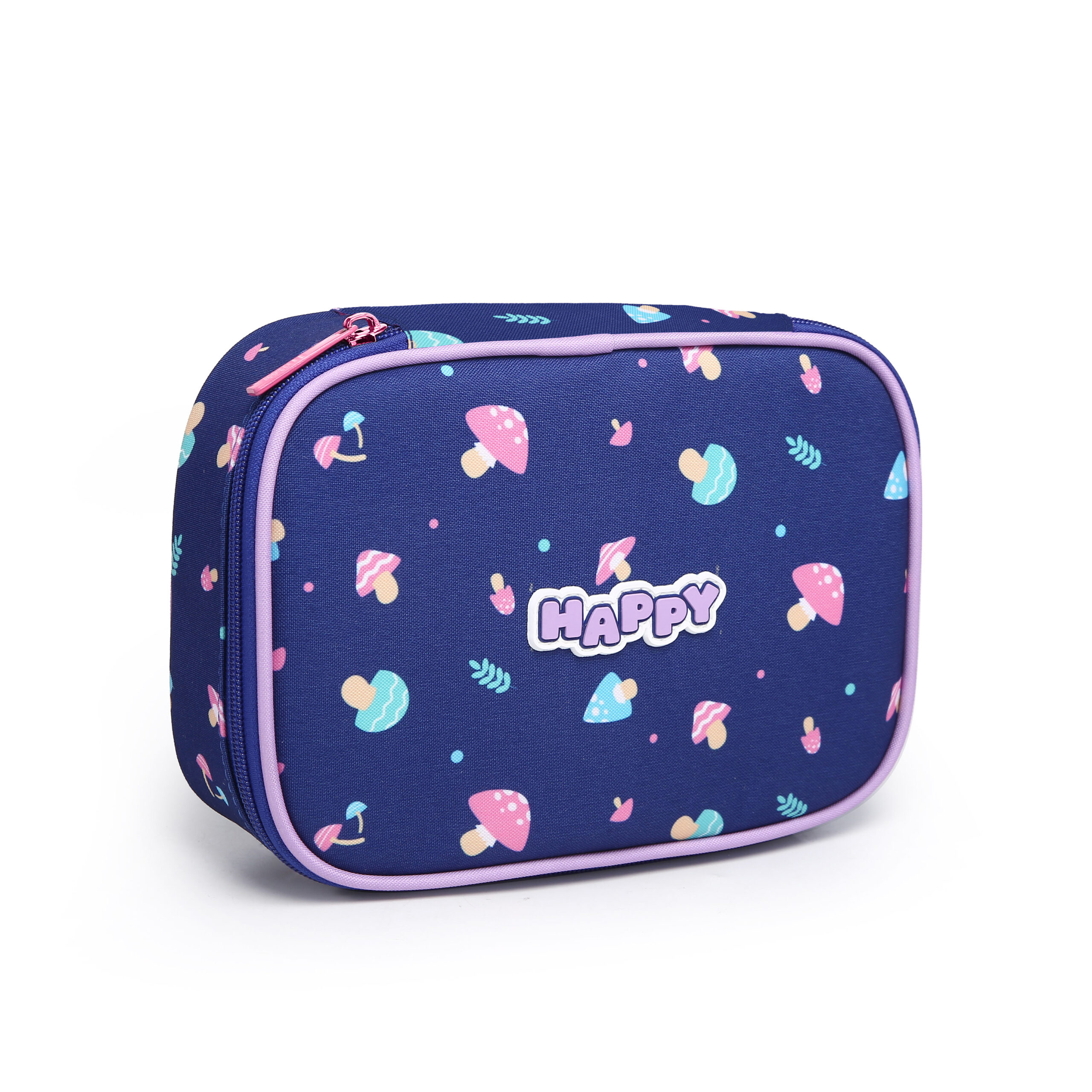 Acompanha mochila com 3 bolsos grandes, lancheira térmica grande e estojo box, tudo no tema Happy, perfeito para a rotina escolar.