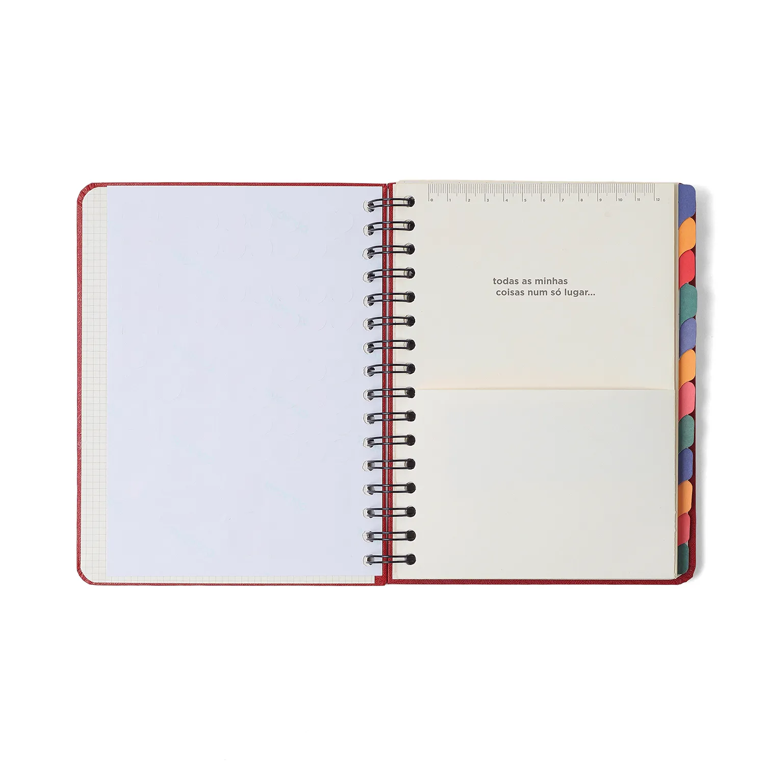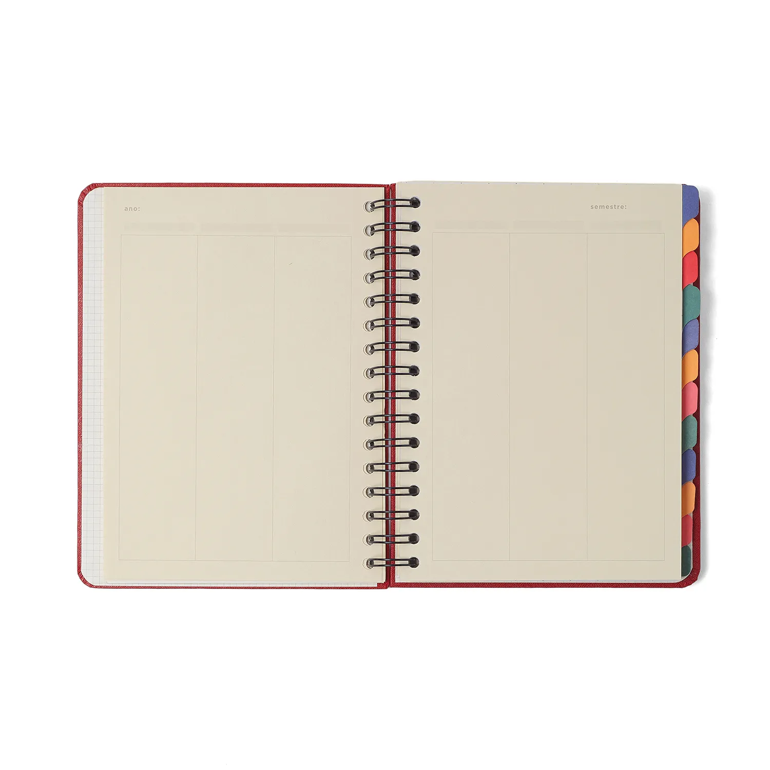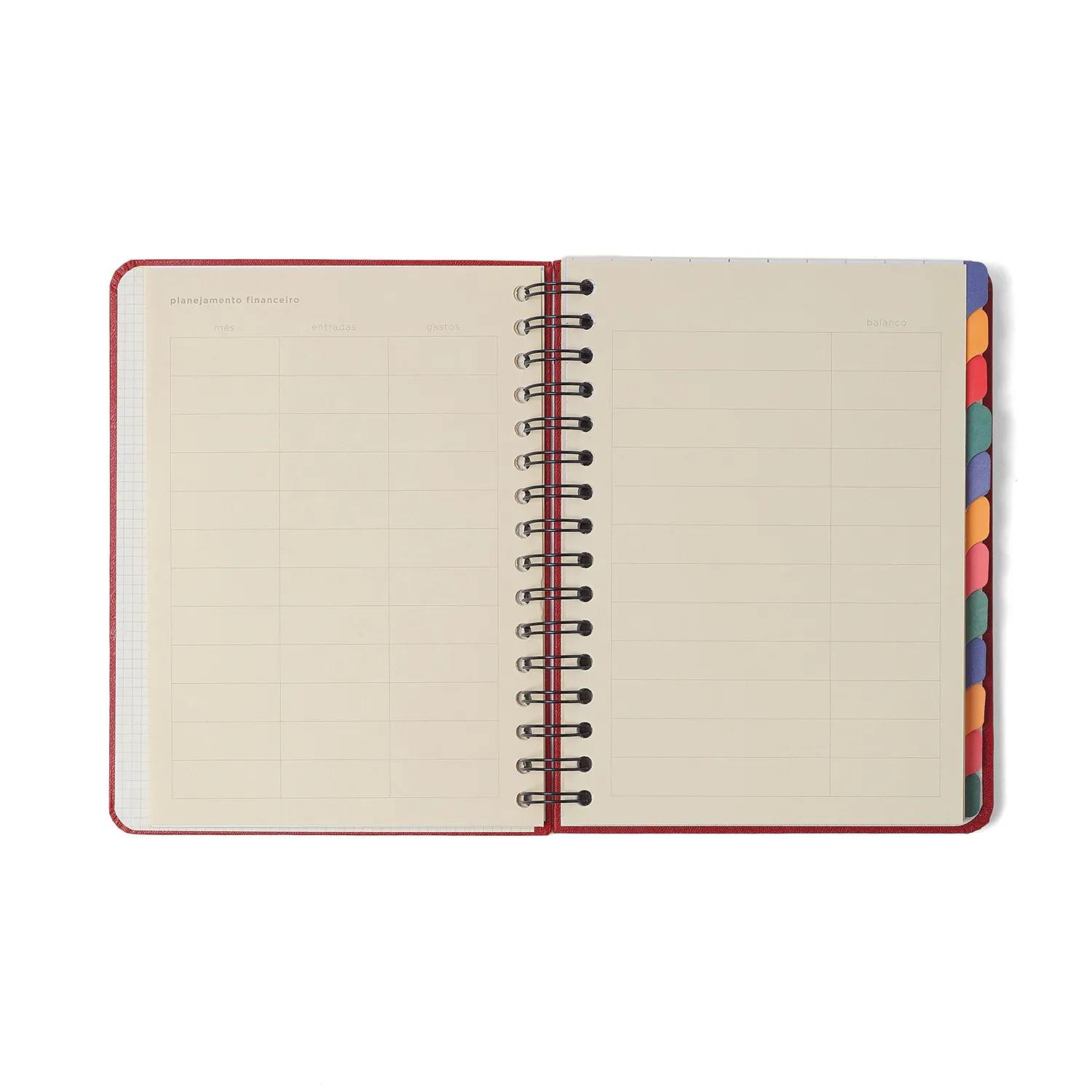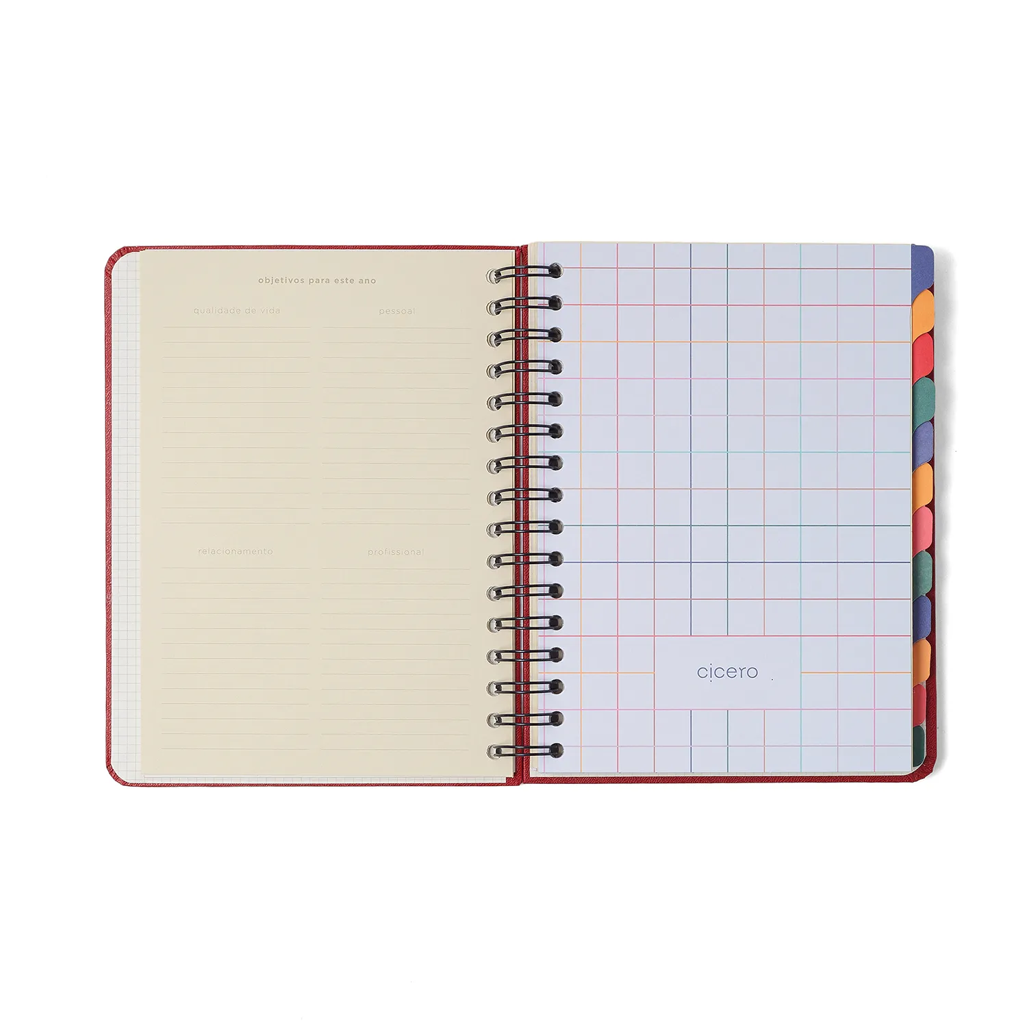 Este planner tem capa dura, cantos arredondados, elástico para fechamento e encadernação em wire-o (espiral duplo). São 100 folhas em Papel Pólen®Natural 80g/m².